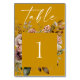 Brighten your reception decor with this stylish deep mustard yellow wedding table number card, featuring romantic watercolor florals and elegant calligraphy. Perfect for boho, rustic, or fall weddings, this table card helps guests find their seats with ease. The bold mustard yellow background (also known as marigold or saffron gold) pairs beautifully with terracotta, sage, blush, and earthy accents. Ideal for autumn receptions.