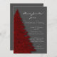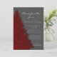 Deep red embossed-look Christmas tree overlays white invitation text on a charcoal grey background.