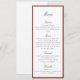 Elegant wedding menu card featuring a refined deep red border and classic script typography. The clean layout and rich red frame create a timeless presentation ideal for formal wedding receptions and sophisticated table settings.