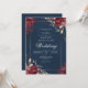 This design features rich, deep red floral accents against a sophisticated navy background. A delicate metallic border frames the composition, evoking a sense of opulent romance.