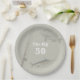 Party plates for the deep sea / saltwater fisherman turning 50, or any age. Customise the text in the centre of tan-grey paper plates which are decorated with fish and a fishing pole / rod and reel.