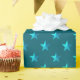 A festive wrapping paper featuring a dark teal blue background with shimmering blue stars in a repeat pattern.