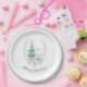 Christmas themed paper plates, with a thin green border around the edge and beautiful watercolor graphics of a white deer and Christmas tree. Custom green text, on the bottom, can be personalised to read what you want.
