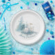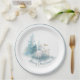 Christmas themed paper plates, with a thin blue border around the edge and beautiful watercolor graphics of a white deer and pine trees. Custom text, on the bottom, can be personalised to read what you want.