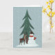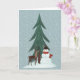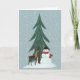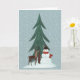 Snowman and deer by pine tree graphic with snowflakes on pastel winter blue background