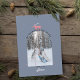 A mod reindeer sits atop an arched family photo on this slate blue and salmon pink holiday card.