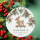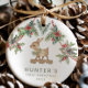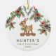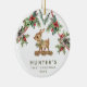 Celebrate your baby's first Christmas with our charming personalised Christmas ornament featuring an adorable reindeer pull toy. This delightful keepsake is beautifully adorned with green pine garland and holly leaves, making it a perfect addition to your holiday decor. Customise it with your child's name and the year to create a treasured memento that will be cherished for years to come.