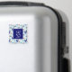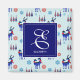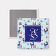 A magnet with a repeating pattern. Illustrated with a pair of blue scandinavian deer wearing red scarves. With decorative markings on their bodies. As well as a trio of red and blue christmas trees with a star on top. Fancy snowflakes sprinkled around. A square layered over top with your personalised monogram initial and name.