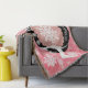 Beautiful Christmas holiday throw blanket features a background of pink with white snowflakes, a ring of solid black with a few white snowflakes, and a centre of pink with tiny white polka dots. Two white deer silhouettes adorn this pretty holiday throw and there's an area you can easily personalise with your family name.