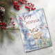 Simple beauty describes the design on this card, with a little deer fawn standing beneath a red berry branch. At the fawn's feet is a holly berry bouquet. The stylised text "Merry Christmas" is in red at the top, and everything is placed on a snow flecked abstract indigo blue and white background. The back of the card has the same background, with a little winter bird perched on a branch. Your custom text is in three fields.