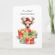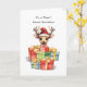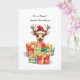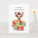 In this delightful Christmas card designed especially for a great grandson, a cheerful deer wearing a Santa hat takes centre stage, surrounded by an array of brightly wrapped gifts. The deer's friendly demeanour and festive attire evoke the spirit of the season, while the colourful presents add an element of excitement and anticipation.