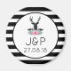 A magnet with the bride and groom's initials and wedding date. Designed with a black deer head with large antlers. Geometric lines inside the face of the deer adds a creative touch. Colourful pink flowers and mint green leaves form a pretty floral bouquet below his head. A mountain range sketch placed amongst the flowers also adds to the rustic country feel. Background is a black and white striped pattern.