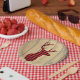 Paper plates with a rustic style. Designed with a deer head with antlers, made of red plaid. An image of wood planks for the background image give it an outdoorsy country feel.