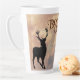 Deer hunter latte mug with name template. Woodland design with deer images and forest background wraps around this tall mug. Colors are brown, tan, gray and black with name in gray printed text on the design’s left side top. Makes a nice gift for a man who enjoys hunting.
