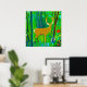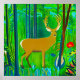 Poster in a stylised illustration of a deer in a fairytale forest setting, surrounded by trees and plants, in shades of brown and green