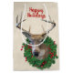 Big buck deer in holiday pine wreath and red berries on sepia old paper design.