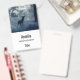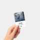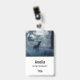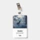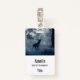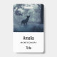 Name badge with a photo of a regal deer with antlers standing in a shadowy forest among sunlit trees. Snow falling all around.
