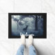 A welcome doormat with a photo of a regal deer with antlers standing in a shadowy forest among sunlit trees. Snow falling all around.
