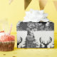 Deer emerges from pine trees and is surrounded by wildflowers in simple wildlife design.