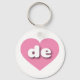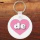 This key chain features a vibrant pink heart containing the bold, white, rounded lower case letters de, a playful abbreviation for Delaware, the first state.
