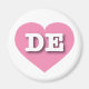 This magnet features a vibrant pink heart containing the bold, white, upper case letters DE, the official abbreviation for Delaware, the first state.