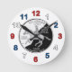 This clock is decorated with the Delaware quarter and has large red white and blue numbers.