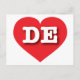 This postcard features a vibrant red heart containing the bold, white, upper case letters DE, the official abbreviation for Delaware, the first state. The reverse side of the postcard is blank awaiting your handwritten sentiments or customised text.