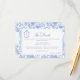 Delft blue floral wedding details card, designed in a refined blend of chinoiserie and French toile de Jouy style. The soft botanical illustrations frame an arched layout featuring an elegant wedding crest monogram, perfect for couples who love vintage, historic, and European-inspired aesthetics. Classic script typography pairs beautifully with the ceramic-blue palette, making this design an effortless nod to the tradition of “something blue.” Fully customizable with your names, date, and location, it’s an exquisite choice for any romantic or sophisticated wedding theme.