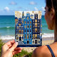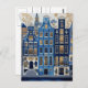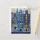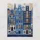 This detailed artwork portrays a row of classic Amsterdam canal houses in the distinctive Delft blue and white style, accented lavishly with gold. The stepped gables and narrow facades are decorated with intricate floral and architectural patterns. The scene, viewed from the canal, captures the historical charm of a Dutch cityscape, combining the rich blue palette with a luxurious, patterned surface that evokes textiles and fine porcelain.
