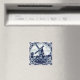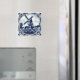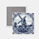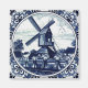 Delft blue tile painting of windmill in background with haystacks in the field in foreground. Includes floral corner borders and frames.