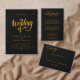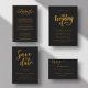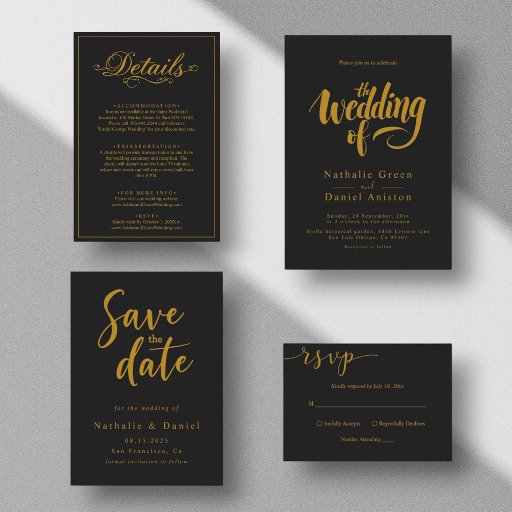 This elegant black-and-gold wedding invitation is perfect for a modern wedding. The simple design features elegant gold calligraphy on a black background. The invitation card includes the wedding details on the back instead of paying for a separate enclosure card.
