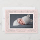 An intricate botanical border in pale blush pink and elegant grey frames your favourite horizontal newborn photo in this beautiful birth announcement for brand new baby girls. Personalise with your new arrival's name, birth stats and your names beneath the photo. Add a second photo to the back if desired, or remove the sample photo to reveal a pattern of blush and white stripes.