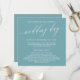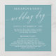 An elegant wedding day schedule with elegant fonts and a delicate calligraphy script in teal blue and white. Add your schedule and the names of your wedding party! Clean, simple, timeless, and elegant.