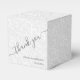 Elegant white on white filigree print pattern with your names and thank you in chic charcoal grey (or any colour) lettering on the front, these 2" square party favour boxes are beautiful for wedding favours, bridal shower favours or any special occasion.