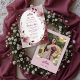 This exquisite quinceañera invitation design stands out for its elegant composition, featuring a delicate oval floral frame that surrounds the main layout with harmony and sophistication. The quinceañera tiara appears as the central element, adding a ceremonial and symbolic touch that represents the transition into a meaningful new stage of life. The burgundy color palette brings depth, distinction, and a refined character, creating a visually striking, romantic, and timeless design.