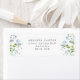 A wedding return address label featuring light blue watercolor flowers and green leaves