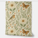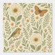 A soft, vintage-style illustration featuring a robin perched on a branch, an orange butterfly in flight, and blooming flowers surrounded by lush green leaves, creating a serene and whimsical garden scene.