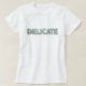 Embrace a look of refined fragility with this unique women's white t-shirt. The word "DELICATE" is beautifully rendered in a sans-serif font, featuring a stunningly realistic cracked glass texture. The letters, transparent with subtle greenish-tinged edges and intricate dark green/grey cracks, create a striking visual. A gentle drop shadow adds a touch of three-dimensional depth, enhancing its breakable, elegant appeal. This design is more than just a word; it's a whisper of caution and a reminder of the gentle strength and precious nature that deserves to be handled with care. Perfect for those who appreciate subtle yet powerful statements.