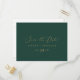 This delicate gold and green save the date postcard is perfect for a modern wedding. The romantic minimalist design features lovely and elegant champagne golden yellow typography on an emerald green background with a clean and simple look.