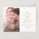 This delicate gold calligraphy photo save the date postcard is perfect for a modern wedding. The romantic minimalist design features lovely and elegant champagne golden yellow typography on a white background with a clean and simple look.
