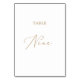 This delicate gold calligraphy table nine table number is perfect for a modern wedding. The romantic minimalist design features lovely and elegant champagne golden yellow typography on a white background with a clean and simple look. The card prints on the front and back (double-sided). Other table numbers in the collection are sold separately.