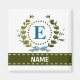 A delicate ivy wreath with a blue striped bow is layered over a fresh white background. Wedding appropriate design features the monogram "E" in blue. Magnet can be personalised with any name over the green ribbon banner. Design tip: For the font shown here, use all caps for the name.