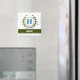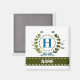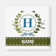 A delicate ivy wreath with a blue striped bow is layered over a fresh white background. Wedding appropriate design features the monogram "H" in blue. Magnet can be personalised with any name over the green ribbon banner. Design tip: For the font shown here, use all caps for the name.