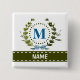 A delicate ivy wreath with a blue striped bow is layered over a fresh white background. Wedding appropriate design features the monogram "M" in blue. Button can be personalised with any name over the green ribbon banner. Design tip: For the font shown here, use all caps for the name.