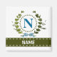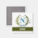 A delicate ivy wreath with a blue striped bow is layered over a fresh white background. Wedding appropriate design features the monogram "N" in blue. Magnet can be personalised with any name over the green ribbon banner. Design tip: For the font shown here, use all caps for the name.