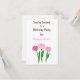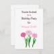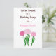 A cute design featuring three pink chrysanthemum flowers with fluffy blooms and long green leafy stems. Customise with all of your birthday party information as desired.
