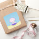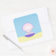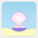 Pink and purple seashell with a beautiful pearl, beach landscape, blue sky, yellow sand.