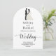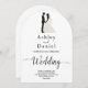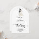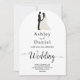 This elegant black-and-white arch wedding invitation is perfect for a modern wedding. The simple design features elegant black calligraphy and a bride and groom illustration on a clean white background. The invitation card includes the wedding details on the back instead of paying for a separate enclosure card.