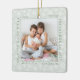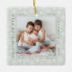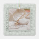 Baby birth stats photo ornament with delicate white snowflakes on a soft green background. The photo template is ready for you to add your baby photo, which is framed with your newborn birth stats. You can add the same photo or a different picture on the back, both of which are displayed in square format so, if you have any problems with placement, try cropping your pic to a square and re-uploading.