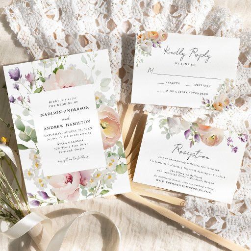 Elegant spring floral wedding reception card featuring a top border of watercolor flowers and foliage in shades of peach, ivory, orange, blush pink, purple, yellow, and green. "Reception" is displayed in a modern calligraphy script. Personalise the watercolor floral reception card with your wedding reception details and wedding website. The design coordinates with our Delicate Spring Floral wedding collection.